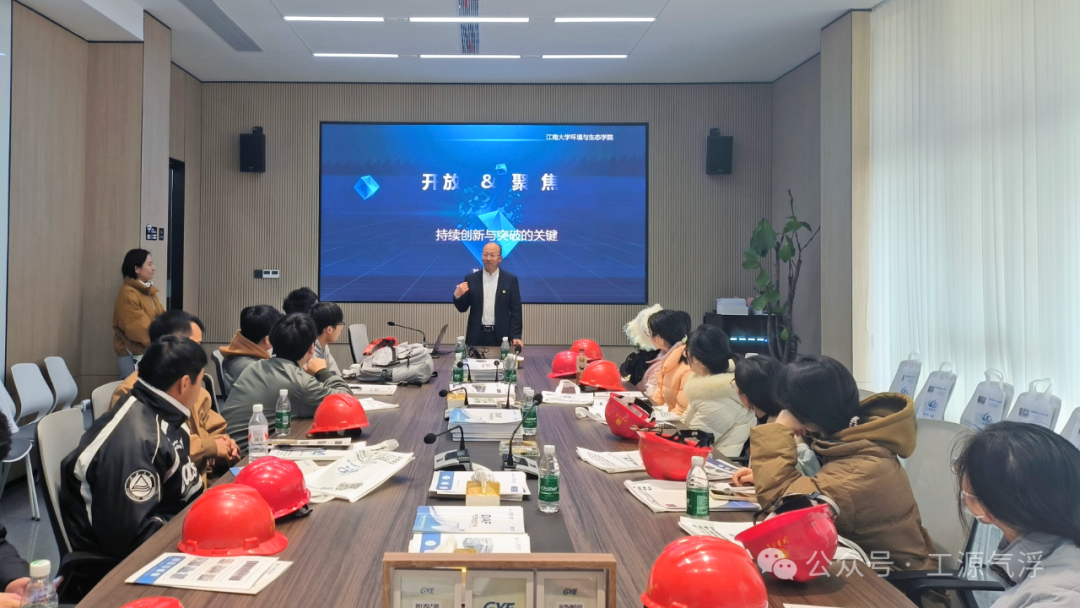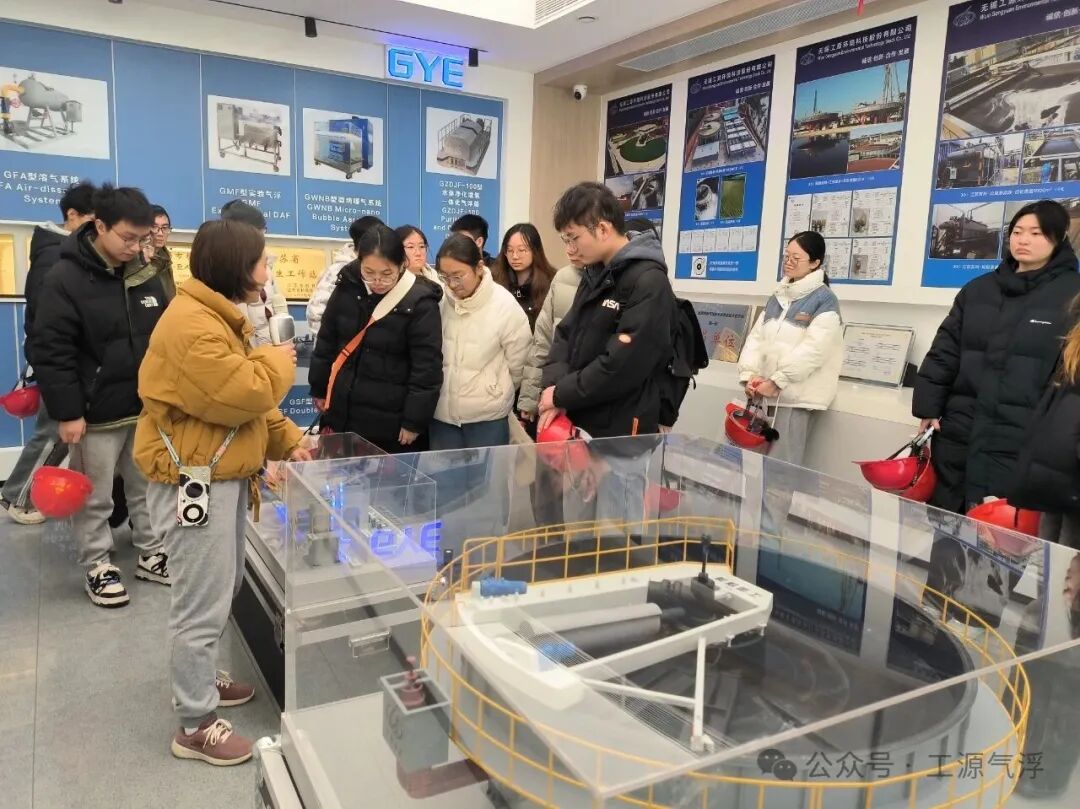 工源公司董事长兼总经理孙连军、总经理助理孙敏贤共同接待来访同学,带领大家参观了工源综合展示厅与气浮工艺研发实验室,并就公司发展历程、气浮种类与原理、气浮应用场景以及气浮工艺实验室免费向外界开放的初衷,为同学们进行了系统讲解。